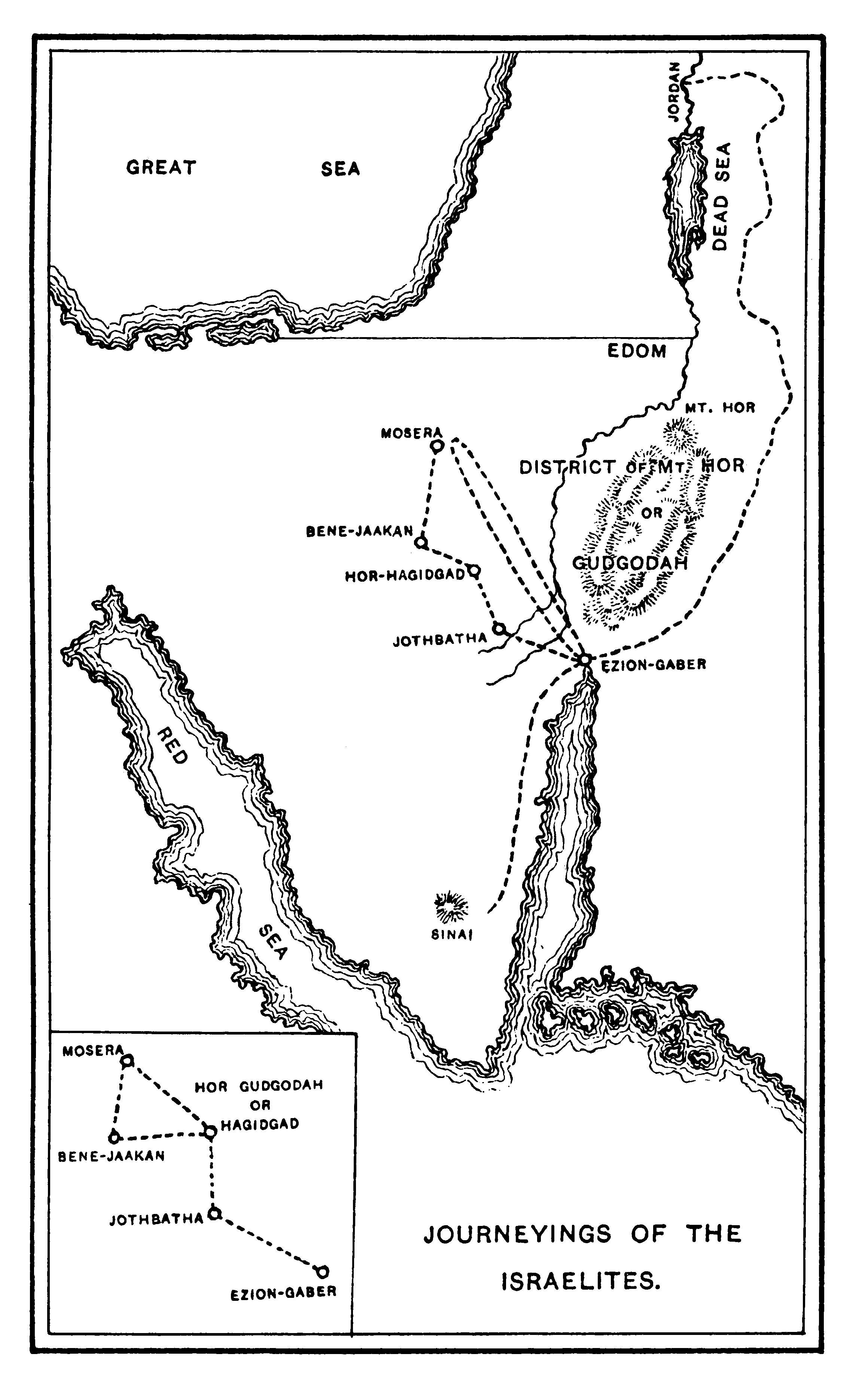 105 - 31, etc., they go from Moseroth by Bene-jaakan, Horhagidgad to Ezion-gaber. Thence they go to mount Hor, and Aaron dies. It was in that country that Arad attacked them; his destruction is related between Aaron's death in mount Hor and their journey back again to the Red Sea. So that we have the journey from Moseroth to Ezion-gaber by Benejaakan and Gudgodah or Hor-hagidgad, from Ezion-gaber back to Hor, and, in chapter 21, back from Hor to Ezion-gaber before they turned round to go northward the other side of Edom to Moab.