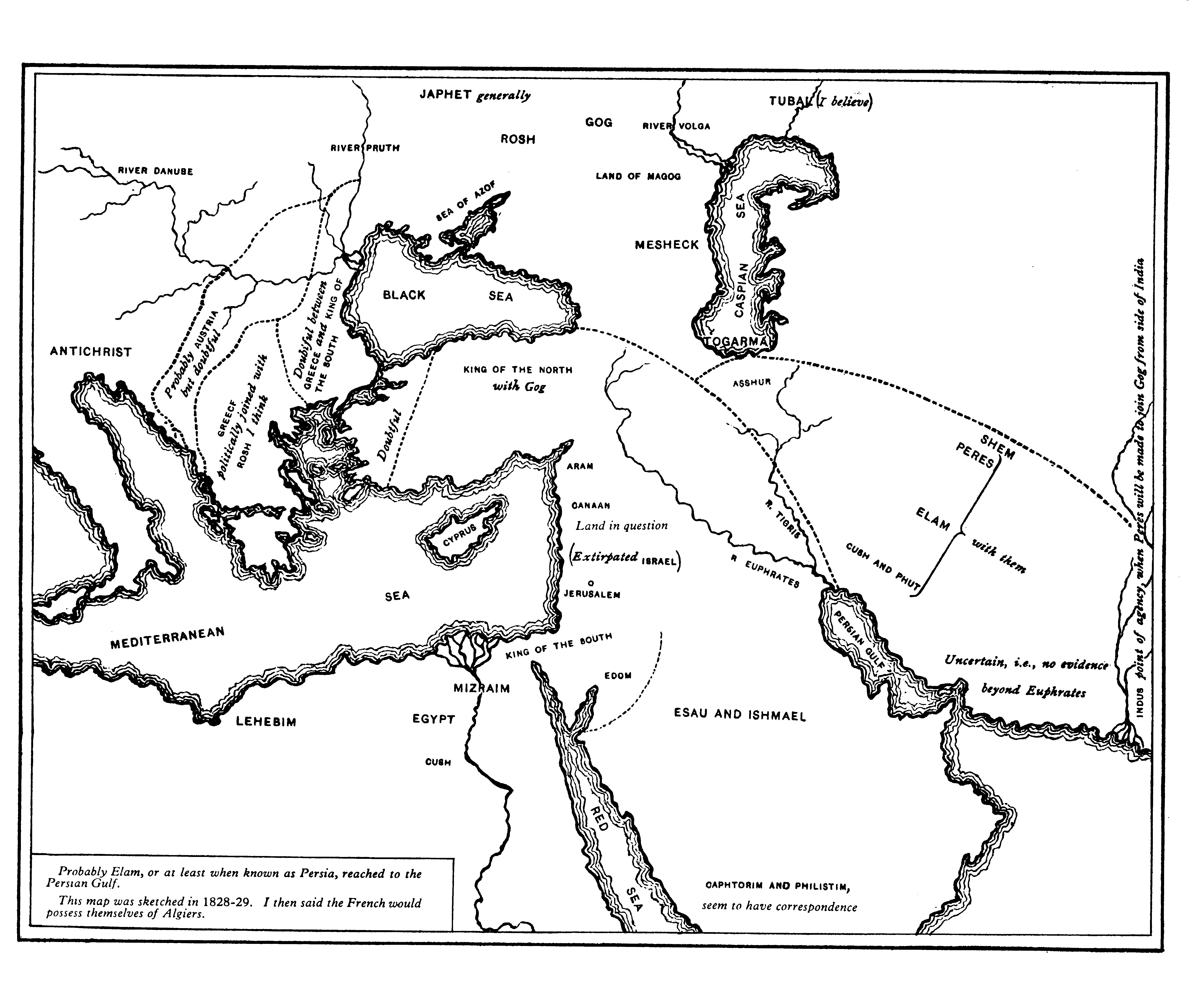 It is my opinion that the French will carry the power of Antichrist overrunning the Mediterranean, and I should think Greece, i.e., carrying them along with them, and should find themselves at the point of division just in the Arabian country, i.e., the point of contact, Jerusalem and Judaea as the southerns always have as we know. Russia, the northern Scythian nations, I am disposed to think the Turks also, but do not feel sure the position they will hold (it is as possessing Turkey, i.e., in Asia particularly, they will be king of the North - but see the distinction put between the Assyrian and Gog) Persia or rather Media and Persia - Peres (see Daniel 5) will be in their train, and also, so I interpret, the eastern Ethiopia or rather eastern descendants of Ham, just as the western or southern descendants of Ham will be "at the steps" of Antichrist or the mature apostate body, for they will be judged as Antichrist, Gog and Magog, for coming against the Jews.